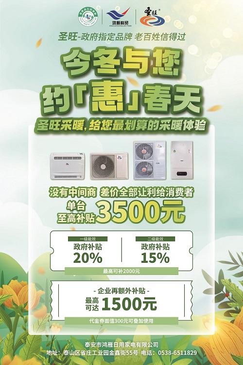 在這個(gè)寒冷的季節(jié),選擇圣旺品牌的空氣源熱泵熱風(fēng)機(jī)、燃?xì)獗趻鞝t及空氣能機(jī)組等采暖設(shè)備,不僅能享受優(yōu)惠補(bǔ)貼,更是為環(huán)保貢獻(xiàn)一份力量。歡迎廣大消費(fèi)者前來選購,讓我們一起溫暖過冬!