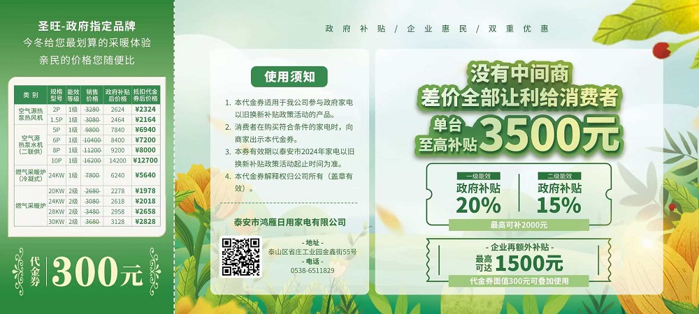 如今,泰安市舉行家電以舊換新補(bǔ)貼政策,我公司三類產(chǎn)品成功入圍,包括空氣源熱泵熱風(fēng)機(jī)、冷水機(jī)組和燃?xì)獗趻鞝t。消費(fèi)者購買我公司一級能耗產(chǎn)品可享受政府 20%的補(bǔ)貼,二級能耗產(chǎn)品可享受 15%的補(bǔ)貼。在此基礎(chǔ)上,我們面向全市消費(fèi)者再額外發(fā)放 300 萬的代金券,單張面值 300 元,共 1 萬張。這意味著在政府補(bǔ)貼的同時(shí),消費(fèi)者還能享受我公司讓利 300 至最高 1500 元的優(yōu)惠,真正實(shí)現(xiàn)政企雙補(bǔ),福利翻倍。